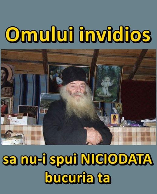 -Aşa, aşa… Adică să nu ne bazăm pe aceia, să le spunem doar necazurile noastre… Exact. Ţine minte aşa: să nu te jeluieşti niciodată la omul invidios, căci cu nimic nu te va ajuta. Pentru că omul invidios nu te poate ajuta, căci în el sălăşluieşte un duh necurat, nu Duhul lui Dumnezeu. Cine are Duhul lui Dumnezeu, are dragoste, are milă, iartă, e iubitor și milos. Omul invidios nu are nimic din toate astea.